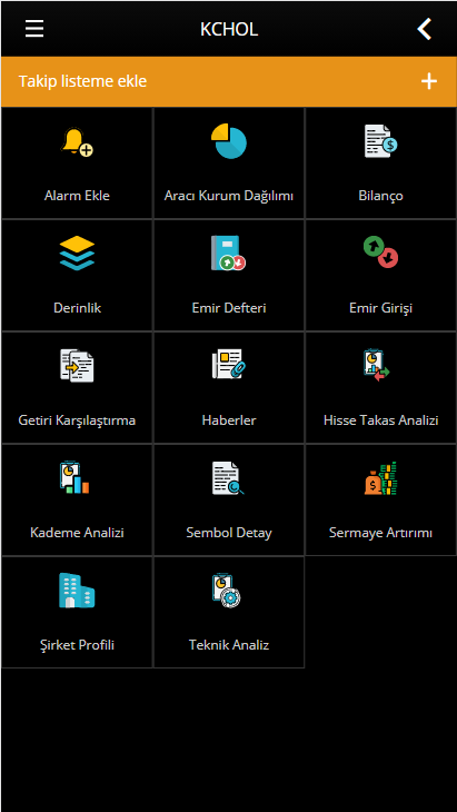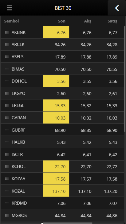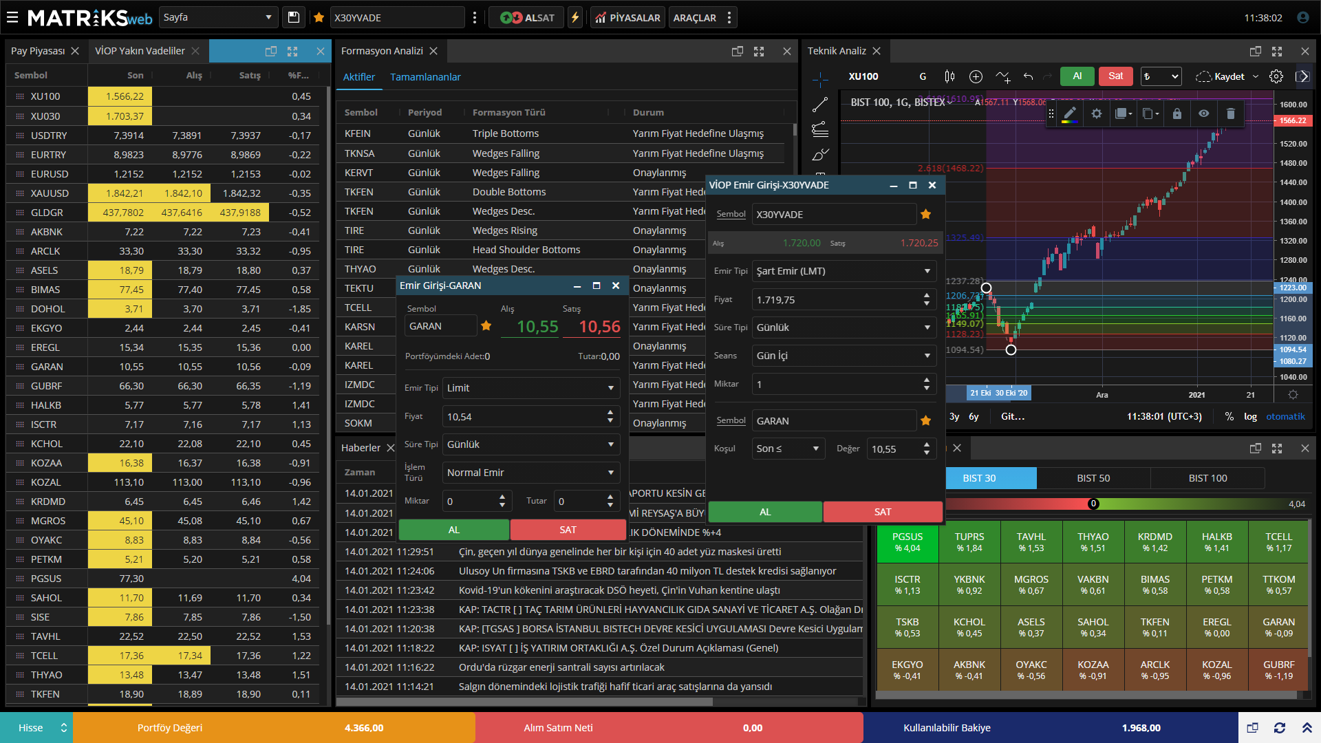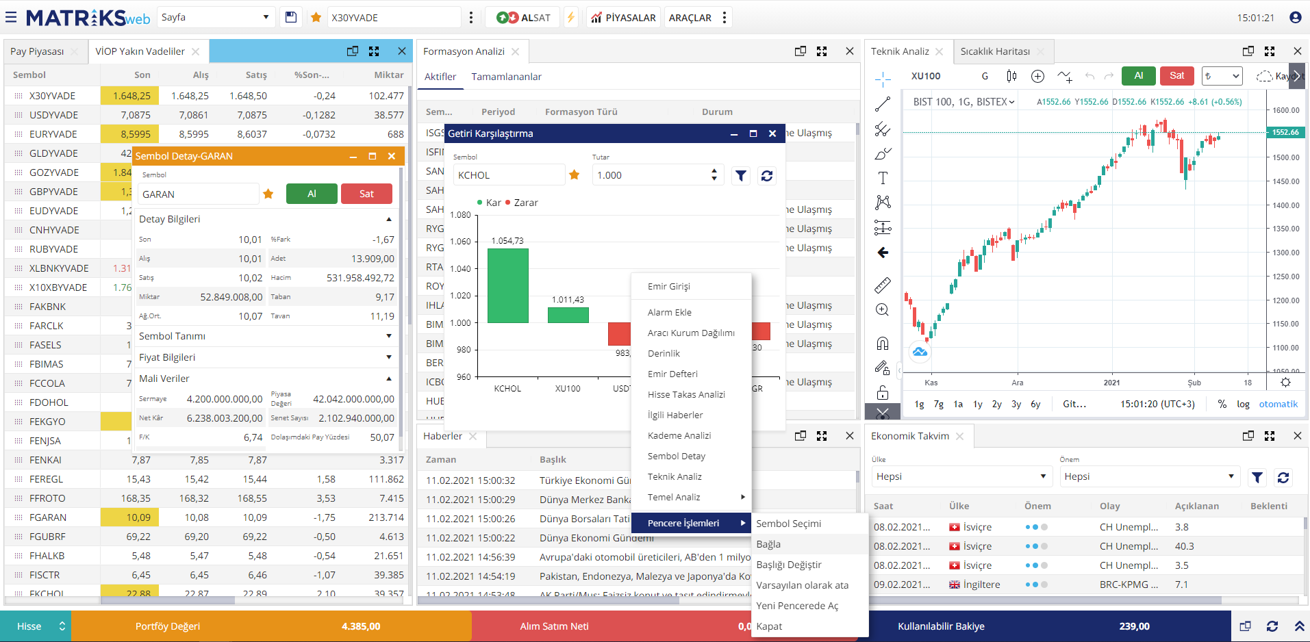 pencereleri seçilen piyasaya özel semboller ve kolonlarla açılır. ·